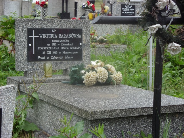 Pochowana tu nauczycielka Wiktoria Baran została rozstrzelana w Morawczynie za działalność konspiracyjną.