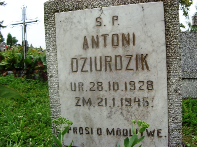 Pochowany tu Antoni Dziurdzik został zastrzelony przez żołnierza Wehrmachtu 21 stycznia 1945 r.