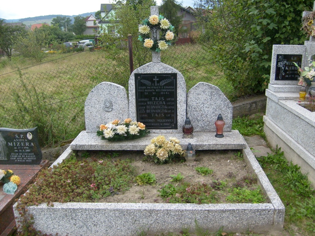 Mogiła ziemna z lastrykowym obramowaniem, u wezgłowia trzy lastrykowe, zakończone łukiem stele. Na środkowej steli zwieńczonej krzyżem czarna tablica memoratywna z napisem: „Ś.+P./ OFIARY PACYFIKACJI Z ZAWADKI/ PRZEZ OKUPANTA HITLEROWSKIEGO/ 28 XI 1944 r./ ANDRZEJ TAJS LAT 67/ ANIELA MIZERA LAT 54/ JÓZEF BEDNARCZYK LAT 46/ JÓZEF BEDNARCZYK LAT 19/ KAROL TAJS LAT 30/ BOHATERSCY MĘCZENNICY/ SPOCZYWAJCIE W PANU!”