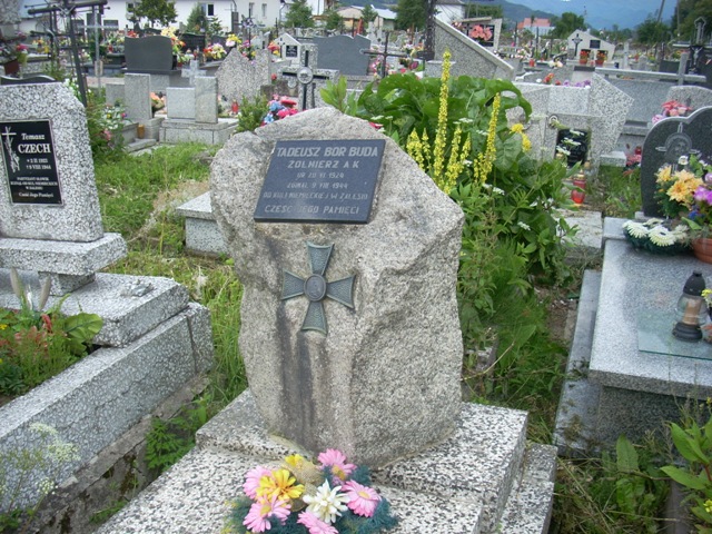 Mogiła obramowana i nakryta lastrykową płytą. U wezgłowia umieszczony jest głaz z tablicą memoratywną z napisem: „TADEUSZ BOR BUDA/ ŻOŁNIERZ AK/ UR. 20 VI 1924/ ZGINĄŁ 9 VIII 1944/ OD KULI NIEMIECKIEJ W ZALESIU/ CZEŚĆ JEGO PAMIĘCI”. Poniżej tablicy do głazu przymocowany jest metalowy krzyż maltański z okrągłą tarczą na skrzyżowaniu ramion.