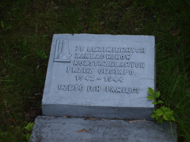 – prostokątna mogiła, na której znajduje się betonowy krzyż z naniesionym na lico żeliwnym ażurowym krzyżem łacińskim z motywem wieńca laurowego, pochodzący ze zlikwidowanego cmentarza wojennego nr 367 w Mordarce oraz tablica upamiętniająca 78 nieznanych z nazwiska zakładników rozstrzelanych przez Gestapo w latach 1942-1944,