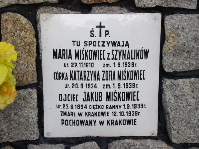 Mogiła wyłożona częściowo wyłożona kostką, częściowa wypełniona ziemią. U wezgłowia mogiły znajduje się zakończona dwuspadowo, nakryta czerwoną dachówką, niesymetryczna ściana pomnikowa z figurą Matki Boskiej we wnęce. W dolnej części ściany pomnikowej wmurowana jest tablica memoratywna z napisem: Ś.†P./ TU SPOCZYWAJĄ/ MARIA MIŚKOWIEC z SZYNALIKÓW/ ur. 27.11.1910 zm. 1.9.1939 r./ CÓRKA KATARZYNA ZOFIA MIŚKOWIEC/ ur. 20.9.1934 zm. 1.9.1939 r./ OJCIEC JAKUB MIŚKOWIEC/ ur. 23.6.1894 CIĘŻKOWA RANNY 1.9.1939 r./ POCHOWANY W KRAKOWIE”. W części ziemnej mogiła obsadzona jest roślinnością wieloletnią i sezonową. Otoczenie mogiły wyłożone jest kostką brukową z betonu.