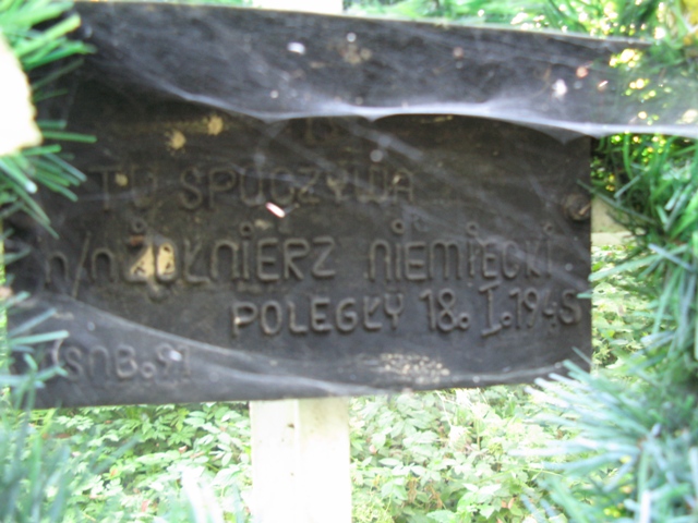 Mogiła ziemna, obłożona kamieniami, oznaczona pomalowanym na biało metalowym krzyżem z tabliczką z napisem: „TU SPOCZYWA n/n / ŻOŁNIERZ NIEMIECKI/ POLEGŁY 18.I.1945/ OSNB. 91”.