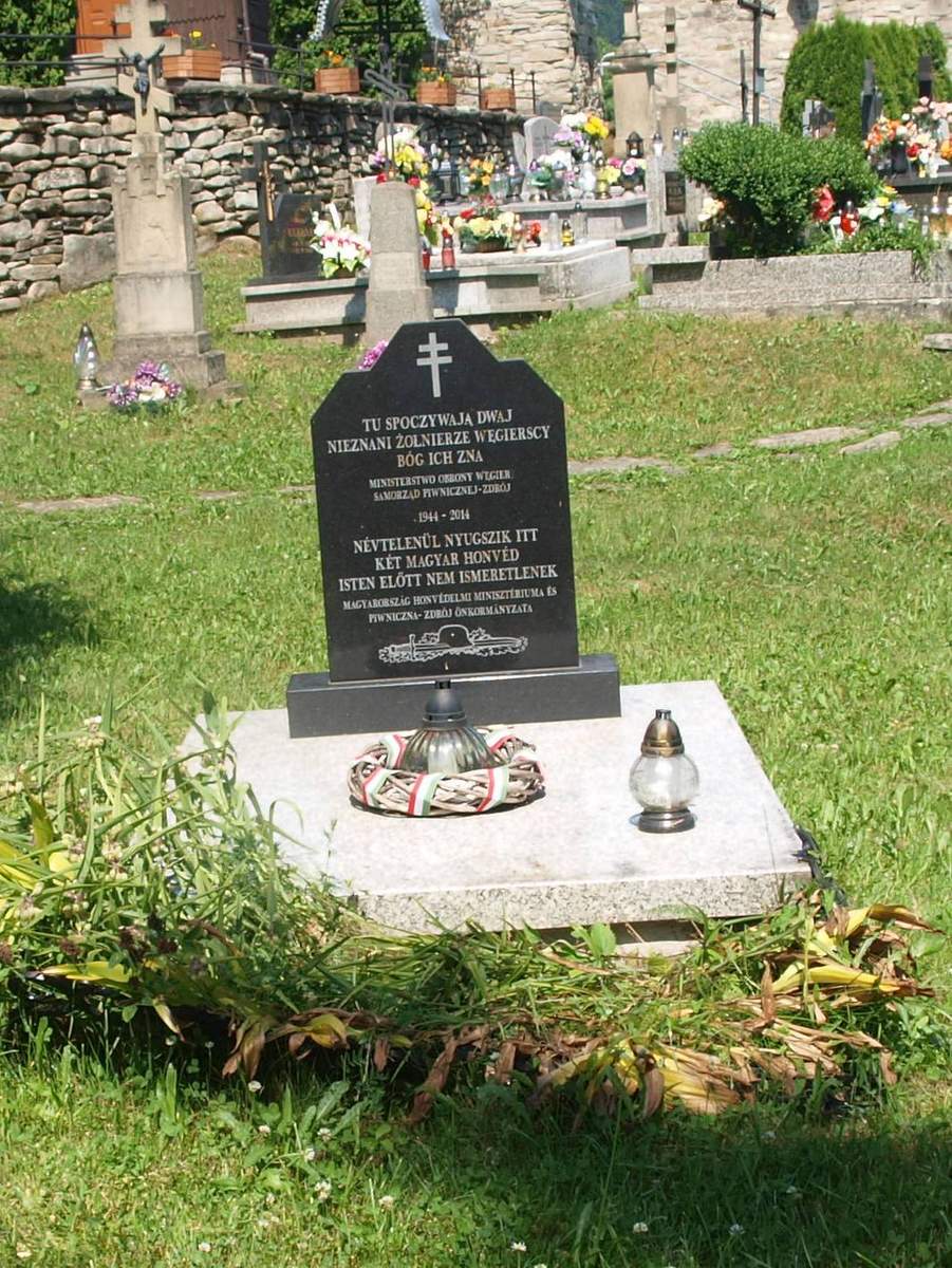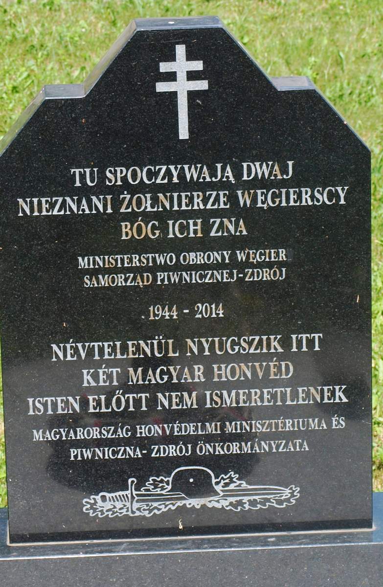 Mogiła nakryta granitową płłytą . U wezgłłowia stela z ciemnego kamienia z wciętymi narożami z wyrytym dwuramiennym krzyżem i napisem: z napisem w języku polskim i węgierskim: „TU SPOCZYWAJĄ DWAJ/ NIEZNANI ŻOŁNIERZE WĘGIERSCY/ BÓG ICH ZNA/ MINISTERSTWO OBRONY WĘGIER/ SAMORZĄD PIWNICZNEJ-ZDROJU”