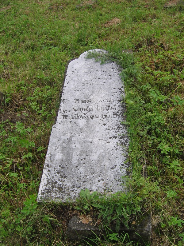 Betonowy nagrobek nakryty płytą z jasnego kamienia z napisami w języku hebrajskim i polskim: „Tu spoczywa błp./ Samuel Besler/ Zamordowany w lipcu 1942 r.”