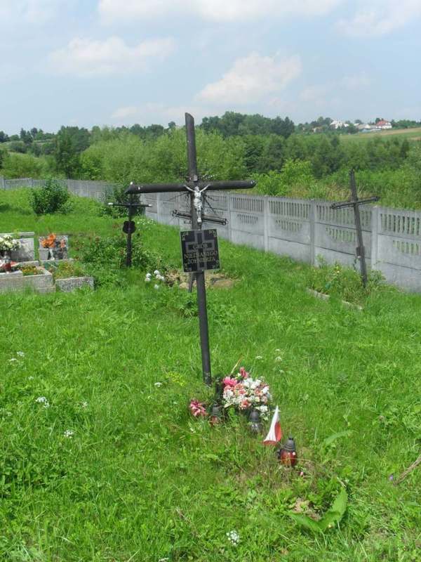 Mogiła ziemna, oznaczona krzyżem z metalowych rur z tabliczką z napisem „GRÓB/ NIEZNANEGO/ ŻOŁNIERZA”.