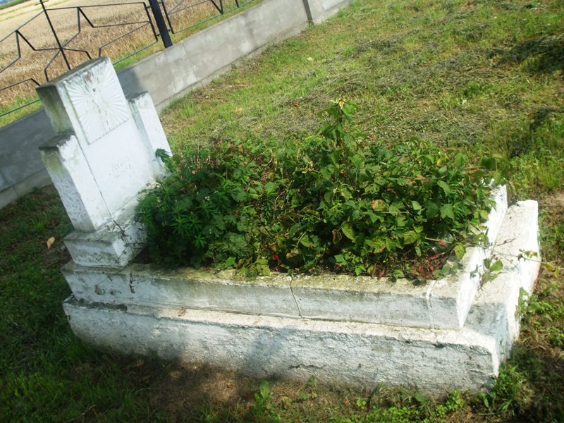 Mogiła ziemna w betonowym, dwustopniowym obramowaniu. U wezgłowia mogiły znajduje się betonowa stela, flankowana dwoma prostopadłościennymi słupkami. Na steli umieszczona jest kwadratowa płaskorzeźba przedstawiająca krzyż otoczony promieniami. Poniżej płaskorzeźby wyryty jest napis. Nagrobek pomalowany jest białą farbą.