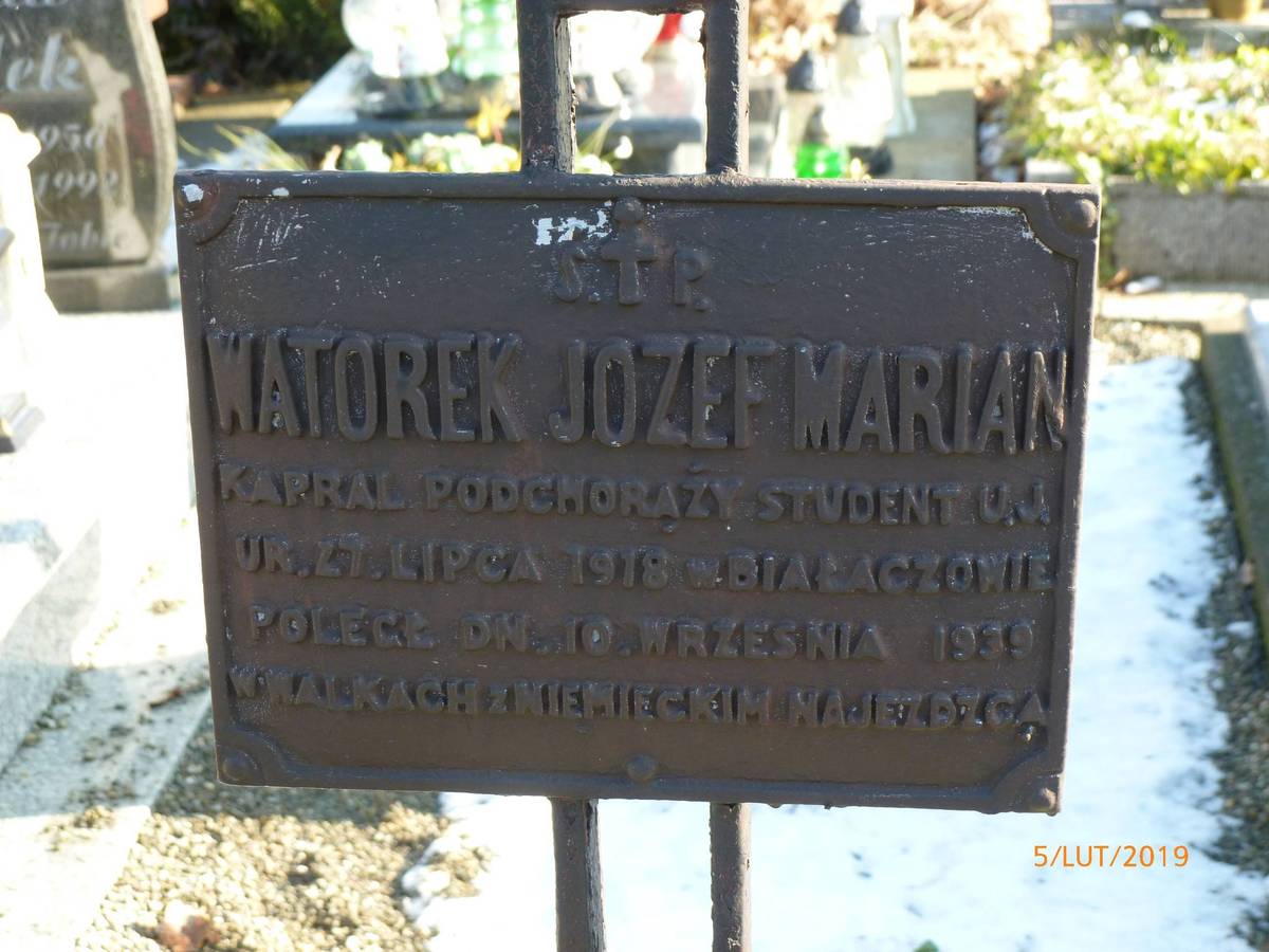 Mogiła ziemna w lastrykowym obramowaniu, u wezgłowia krzyż z metalowych prętów z pasyjką, promienistą glorią i metalową tabliczką z wypukłym napisem „Ś.†P./ WATOREK JÓZEF MARIAN/ KAPRAL PODCHORĄŻY STUDENT U.J./ UR. 27 LIPCA 1918 w BIAŁACZOWIE/ POLEGŁ DN. 10 WRZEŚNIA 1939/ W WALKACH Z NIEMIECKIM NAJEŹDŹCĄ".